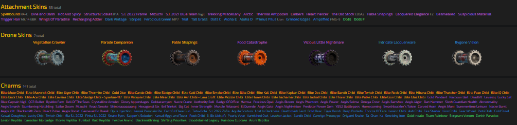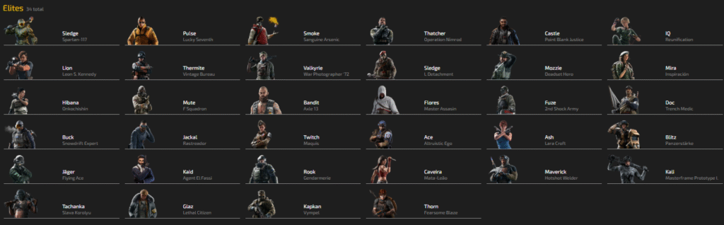 Elites (34): Sledge — Spartan-117 & L Detachment; Ash — Lara Croft; Thatcher — Operation Nimrod; Valkyrie — War Photographer ’72; Pulse — Lucky Seventh; Tachanka — Slava Korolyu; Hibana — Onkochishin; Jäger — Flying Ace; Doc — Trench Medic; Kali — Masterframe Prototype I; …